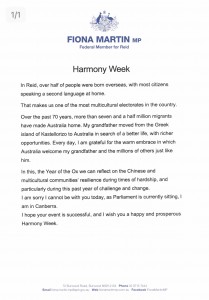 It is my great pleasure to deliver this message on behalf of Dr Fiona Martin to Little Red Hat’s Harmony Week event. As the member said all immigrants are grateful to Australia and hope to use their own strength to build a diversified and harmonious society.